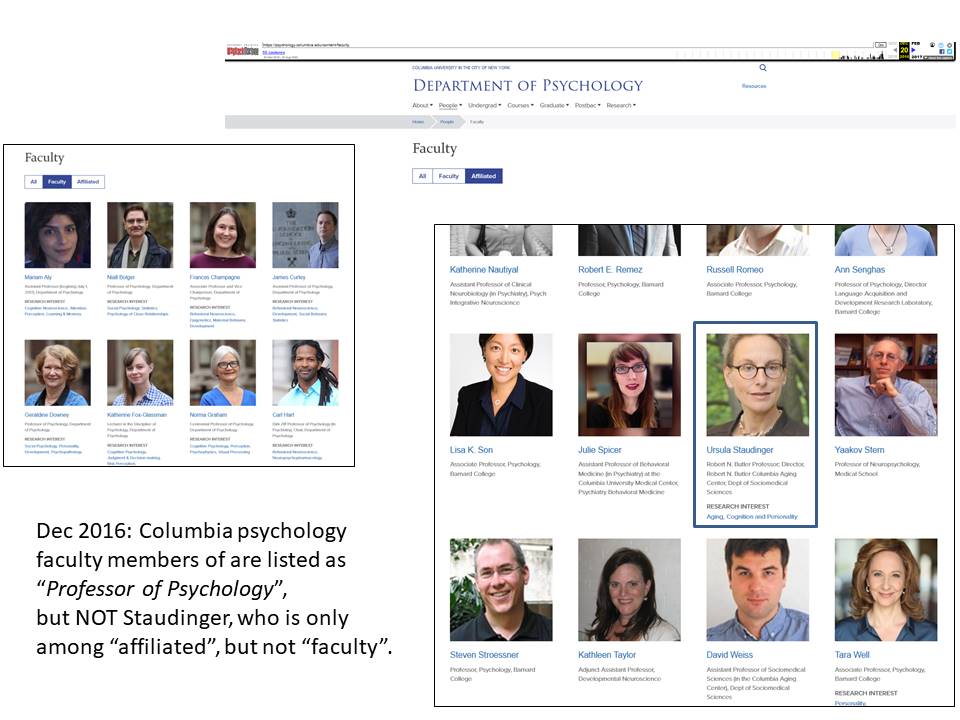 Look at the archived history of their faculty page from 2016-2017. Everyone else is presented as “Professor of Psychology” or “Professor, Department of Psychology”, even the adjuncts and visiting professors, but not Staudinger whose other presentations insist she was full professor at that faculty. And yet, one doesn’t find her on Columbia’s page among “Faculty”, just among “Affiliated”. Only her other Columbia professorship in socio-medical sciences is mentioned, the “Robert N. Butler Professor” title, which turned out not as “lifetime” as we used to be informed. Why such discrepancy? Staudinger refuses to explain.