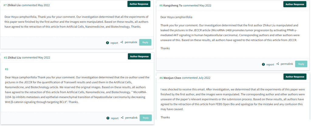 Within this #5 corpus we find “microRNA-526b serves as a prognostic factor and exhibits tumor suppressive property by targeting Sirtuin 7 in hepatocellular carcinoma” (Liu et al, 2017). This encountered criticism in PubPeer, on account of several Figures having featured in earlier products of the studio. Corresponding Author Qiuran Xu came to the paper’s defence, providing evidence of possession of originals, while arguing that the research collaboration had been underway since 2012 but unspecified miscreants had pilfered copies of the images along the way:
