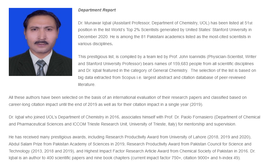 And in March 2021, Iqbal’s University of Lahore celebrated that their assistant professor of chemistry made it to the “51st position in the list World’s Top 2% Scientists” in a Stanford University list by John Ioannidis.