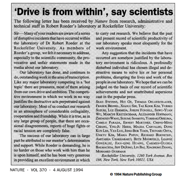 There must have been a very toxic climate in Roeder’s lab at Rockefeller, where only the cheaters flourished. The Wall Street Journal broke a crazy story in 1994, which was picked up by New York Times and others, here a summary by AP (typos theirs):
