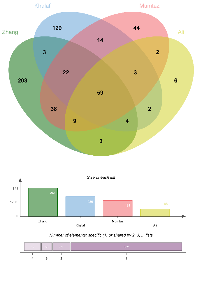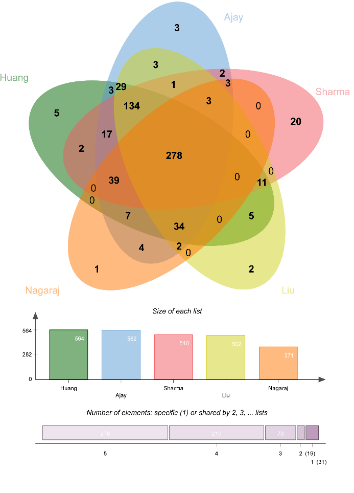 The individual guest editors are of little interest to me – they are interchangeable and replaceable – but I do care about the papermills’ relationship with the publishers. This means I need to find the common characteristics of products that may have come from the same paper mill, and where they were published. Many reported irrelevant citations, and I noted in my early investigations that some papermill products were often found as irrelevant references. Once enough records had been accumulated, I found that probably less than 0.3% of the references were cited more than 10 times, but most of the top 50 were clearly from a handful of authors. I found three clusters by citations (Cluster Huang, Cluster Zhang, and Cluster Editor Li), and then clustered papers with the topic of ideological and political education as the fourth cluster (Cluster Marxism) and papers with the bizarre data availability statement of “The simulation experiment data used to …” as the fifth cluster (Cluster Simulation). These five clusters were placed as five fields in the Hindawi spreadsheet. They contain 1,717 records from 40 journals, and a Venn diagram shows that 1,644 of these records exist in only one cluster.