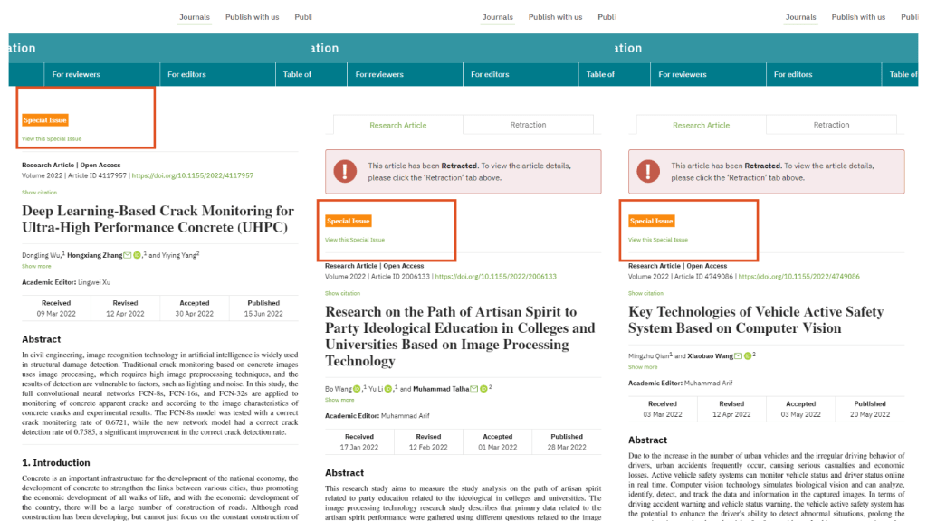 Unfortunately, these are the three journals that have been found to be problematic. De Gruyter’s Nonlinear Engineering surrendered its publishing process in regular issues (see Lv &Yu 2022) to the same papermill as some special issues of Hindawi journals did. IET Collaborative Intelligent Manufacturing, a journal launched by Wiley in collaboration with Huazhong University of Science and Technology in 2019, invited Pradeep Kumar Singh to edit a special issue in 2021, and it was this special issue that published two of Huang’s highly cited articles. This special issue is special because unlike the journals by Hindawi, Frontiers and MDPI, which can publish special issues on demand, the Chinese government only allows journals registered in China to publish two (any kind of) supplemental issues per year. Singh edited another even more gibberish-full special issue for Hindawi in 2022. International Journal of Emerging Technologies in Learning has at least acknowledged that their publishing process was being disrupted by paper mills during 2020 to 2021. By December 31, 2022, it seems that none of the papers in the spreadsheet that cited the garbage from Nonlinear Engineering or IET Collaborative Intelligent Manufacturing were retracted by Hindawi.