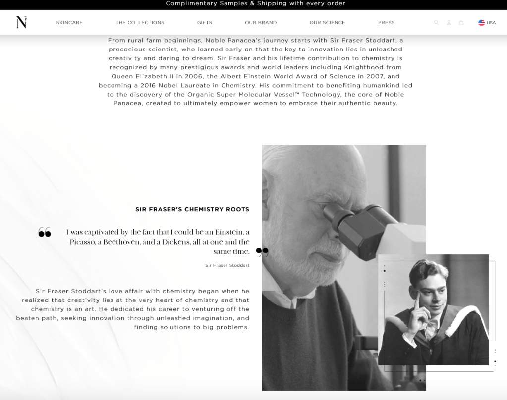 We are informed it’s all based on the Nobelist’s own discovery of the “Organic Super Molecular Vessel™ Technology”, which is “the core of Noble Panacea, created to ultimately empower women to embrace their authentic beauty“. No, they did not steal Sir Fraser’s identity. No, they didn’t trick a confused old man into signing off as advertising mascot. Noble Panacea is his own personally-owned business, set up by Stoddart under the name of PanaceaNano right after he won the Nobel Prize (read the advertisement in the ACS magazine C&EN from 2017). It even seems, Stoddart’s academic employer in USA seems to be financing it as a spin-off: