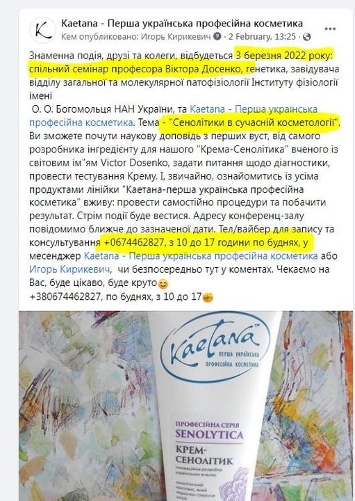 Dosenko was even supposed to give a promo seminar for Kaetana, just when the full-scale war began. As the company’s owner Ihor Kirikevich announced on Facebook for 3 March 2022, e.g here, or here: