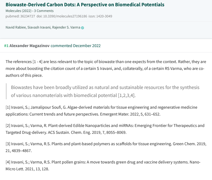 • A newly published Lancet paperThe global burden of cancer attributable to risk factors, 2010–19: a systematic analysis for the Global Burden of Disease Study 2019” with around a thousand of authors, unusually many of them Iranian, and some are known fraudsters and papermillers. Javad Sharifi-Rad: ““discoverer” of some curious medical phenomena such as *peevish inside disorder* and *fly slack*“, Mohammad Reza Saeb: “a “chemist” from the cluster of Rafa Luque, Raj Varma and similar crook“, Khalid Mehmood: “an “expert” in drawing correlations between carbon dioxide emissions, urbanization rates, GDPs and whatnot. While his nominal field is full of fraud and citation stacking, the relation to the Global Burden of Disease is obscure“, Ebrahim Mostafavi: “a nano-fabricator from the cluster of TJ Webster. He has a significant PubPeer record“.