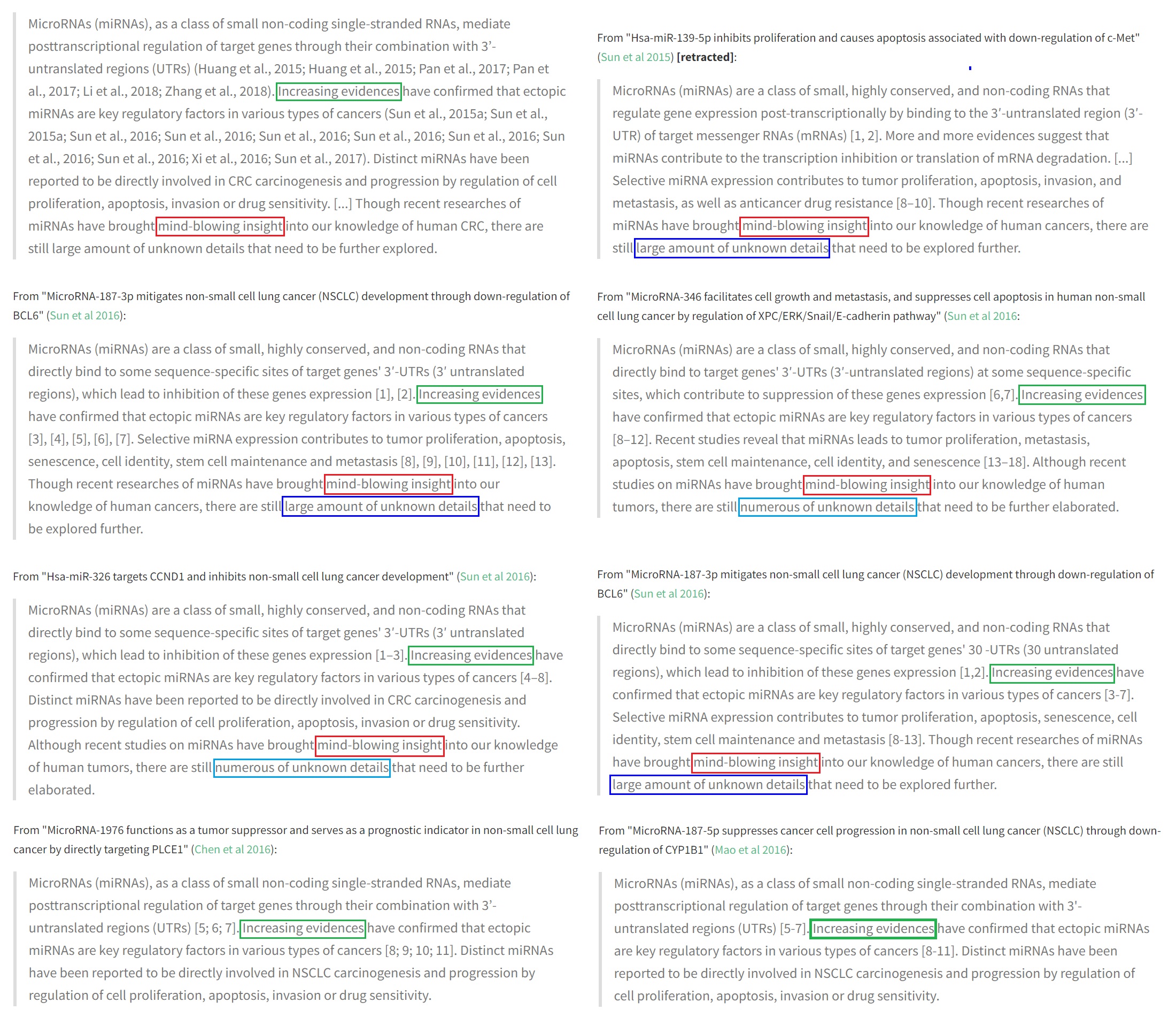 Closer inspection of this little genre reveals Introductory and Discussion passages that follow a stylised course. Clearly a number of papers have been hastily assembled from Lego-blocks of prose, hewing closely to a template – one that seems to have been tailored for the Elsevier journal Gene, where most of the manuscripts found homes. All on the general topic of long non-coding RNAs as facilitators or markers of (or impediments to) cancer. Here are some more of the verbal building-blocks: