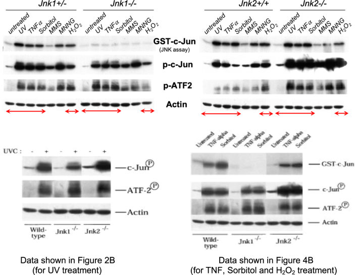 During the re-analysis of our original and published data, we noticed that the Actin Western blot of JNK2 cells was inadvertently used as a loading control for both JNK1 and JNK2 cells in Figs. 2B and 4B. The two unprocessed Actin Western blots corresponding to JNK1 and JNK2 cells are shown below, along with the erroneously duplicated Actin Western blot of Figs. 2B and 4B.