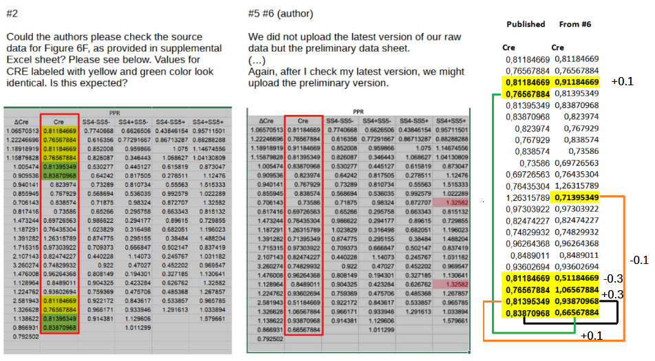 The ΔCre replacement data nicely eliminates all repeated sequences, but does so by adding or subtracting 0.3 or 0.2 from six of the as-published values. The sum of these differences is 0, hence the mean of the ΔCre column remains unchanged. This looks like a carbon copy of the Fig. 6F correction discussed above and should not have happened by chance.