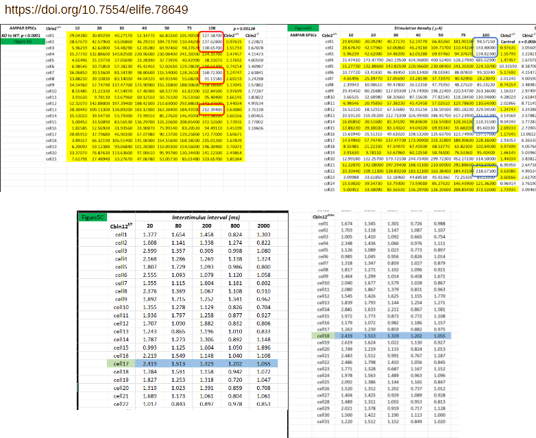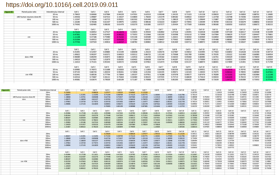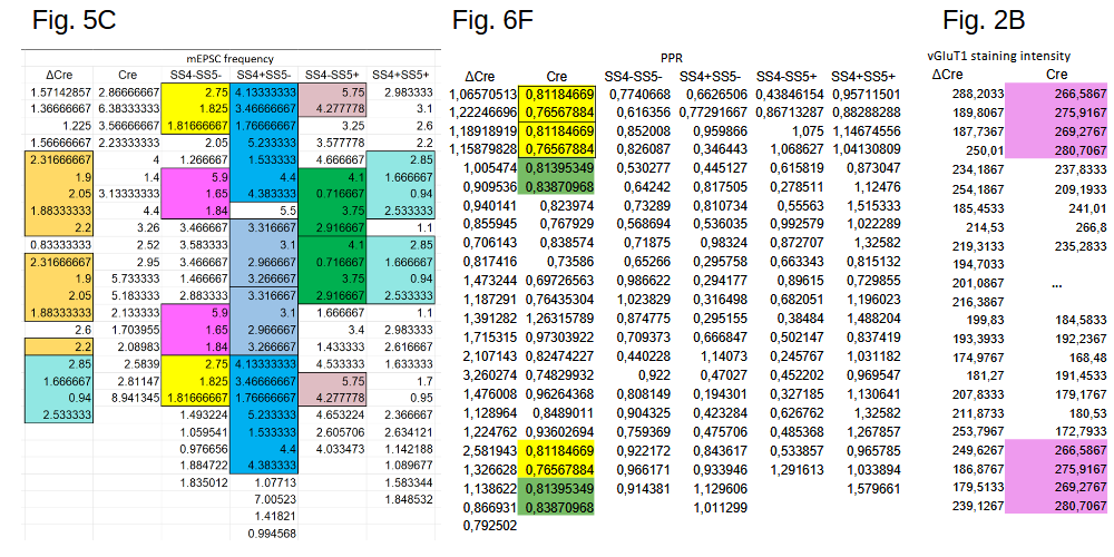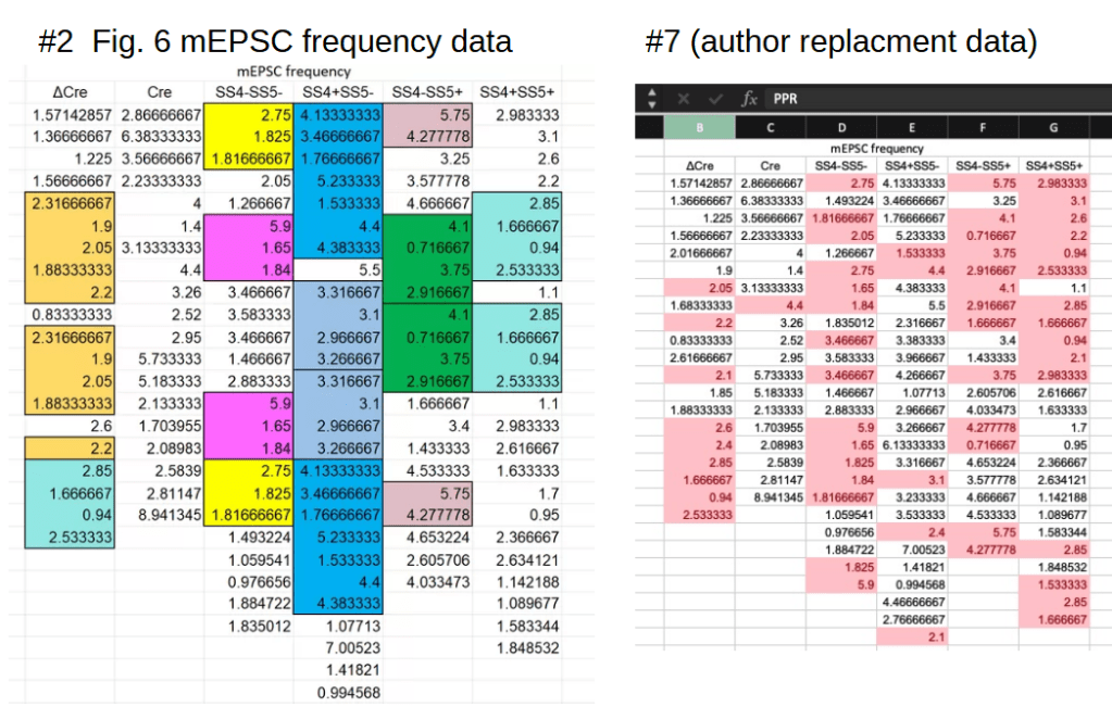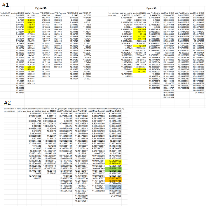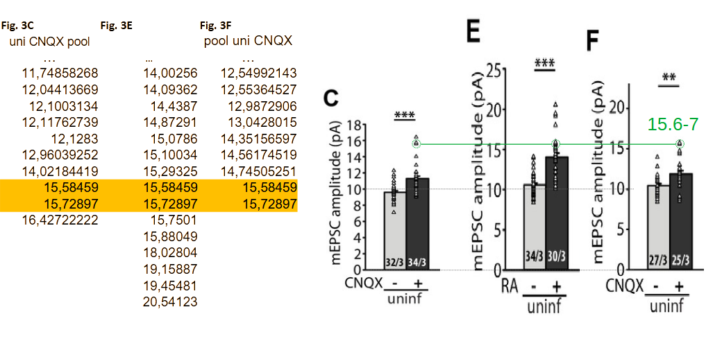 The appearance of identical data is caused by the cutoff (rounding) after five decimal points. The spread sheet attached here show all the highlighted data under question, with the rounded data (5 decimal points) on the left (columns B and F), and fully extended original on the right (columns D and H). As you can see, they are different number originally, only made to look the same because of rounding by Excel. For full transparency, we also provided the mEPSC frequency data for each of these cells in columns C and G. In each and every case, the cells that appear to have the same amplitude have vastly different frequency data, becasue they are indeed different cells.”