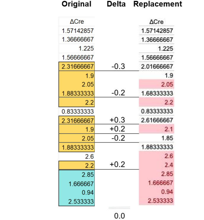 The differences between the as-published and corrected values are highlighted in yellow in the right panel. And they are remarkable. For one, the average Cre value in the original and corrected sets is identical in all its 15 decimals: 0,835768218260869. I made an attempt to calculate the probability of this happening by chance and came to a one-in-ten million number. And then the statistics sleuth Nick Brown noted that the corrected values are simply 0.1 or 0.3 larger or smaller than the original ones (right). This is an extreme coincidence and seems to point at data fabrication.