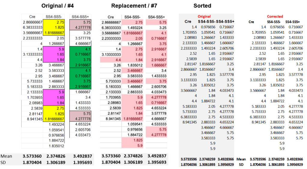 The original Cre column did not show duplicated sequences and is incidentally the only one to remain unchanged after correction. The correction does change the SS4-SS5- and SS4-SS5+ columns, again eliminating all repeated sequences. Looking in more detail it turns out this is done by changing the order of the values in these columns. This can be best seen when the values are sorted, right panel above: the sorted original and corrected data are simply identical. It is obvious that addressing concerns on the improbability of repeated sequences by randomizing the order of values is not genuine.