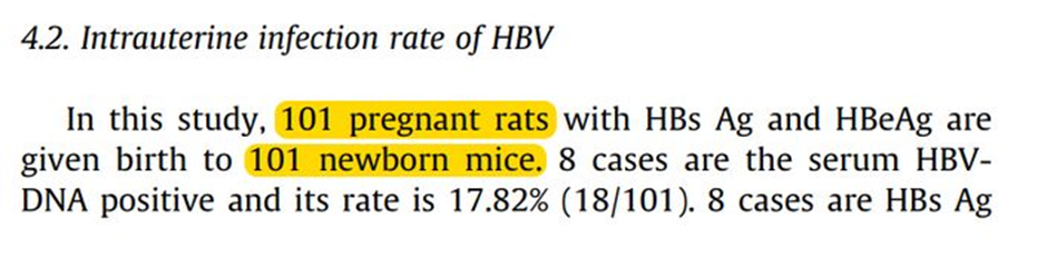 So, is this a groundbreaking discovery? Or a troublingly ignorant author? The rest of the paper made about as much sense as the response. Supposedly, the rats gave birth to a litter size of one after a gestation period of 40 weeks?! Other PubPeer commenters (who I am inclined to believe) contributed further problems: HBV is unable to infect rodent hepatocytes nor can it transmit vertically in these animals. There is no way to collect 6 ml of blood from a mouse pup, which is typically <1 gm body weight… It seems likely that this paper was clumsily adapted from a human study into a paper about micerats, without accounting for much of anything, least of all biology.