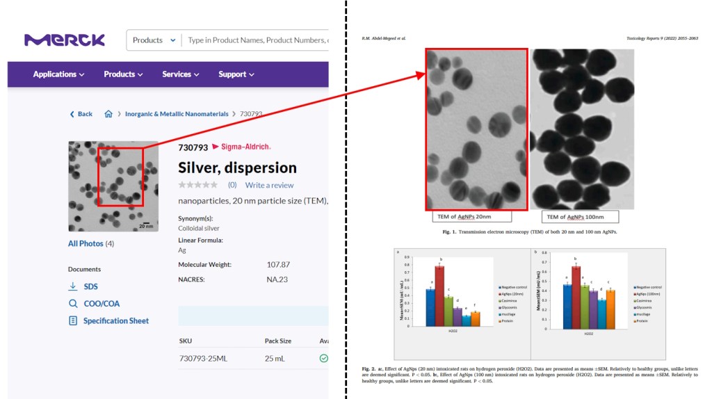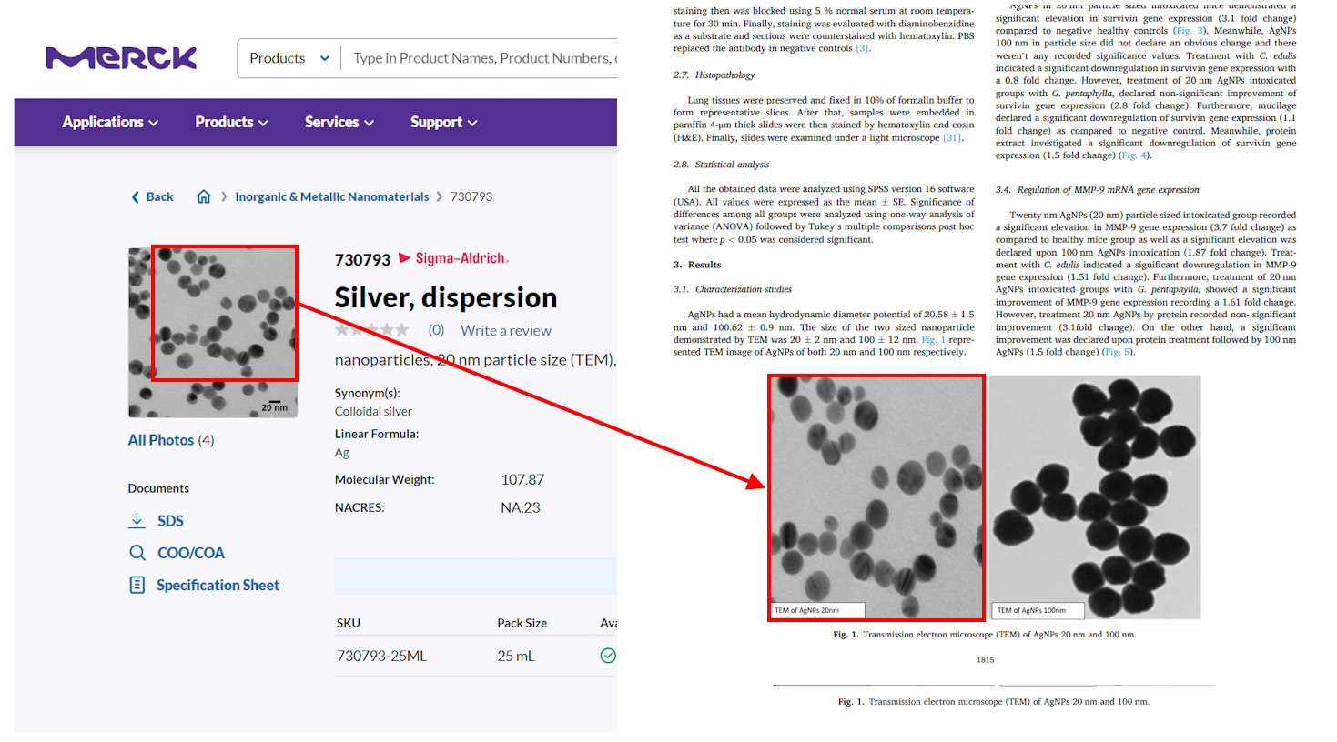On the subject of nanoscience, another edge case that I eventually excluded were these two papers where the authors republished TEM images of nanoparticles directly from Merck’s sales page. The language of these papers seems to imply that authors actually performed the analysis. Since these images were not published in another paper, they are not included in the preprint.