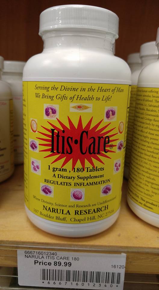 I’m not sure if it is still possible to buy products from Narula Research, however I did find a 2017 Facebook post showing a photo of their supplement product “Itis Care”. The text on the label does not inspire scientific confidence:
