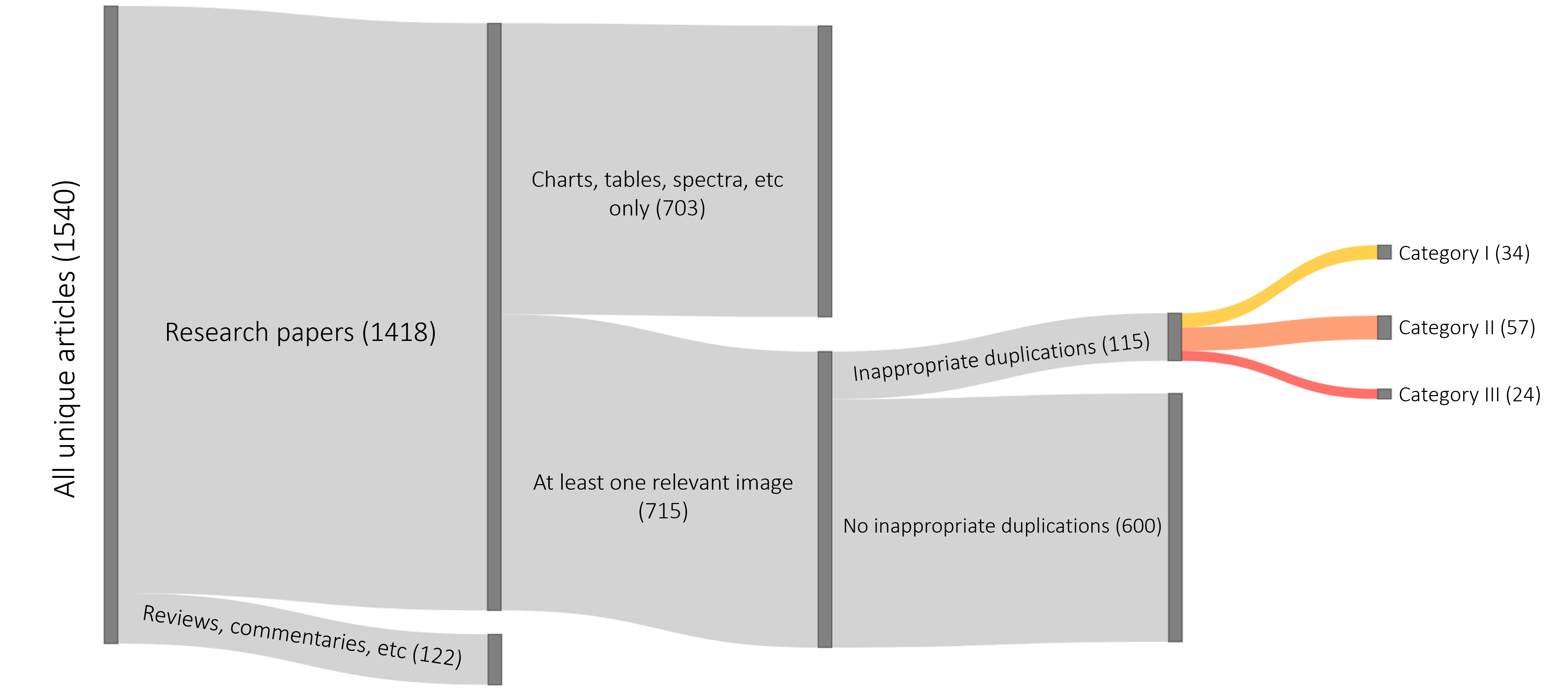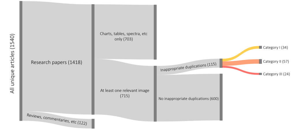A quick summary of the results of the preprint: Since inception to present day Toxicology Reports published 715 research papers with relevant images, 115 of these papers (or 16%) include at least one inappropriate duplication. The Sankey Diagram below, reproduced from Figure 2 of the preprint, shows the flow of papers through the study, and the categories of duplications identified.