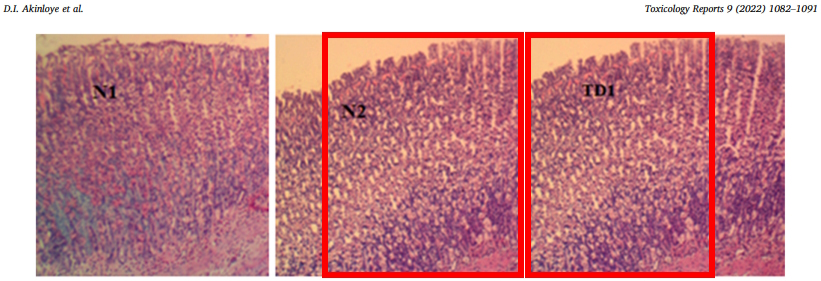 One more example of an impressive Category II duplication from Toxicology Reports, as it would be unfair to exclude Chinese authors in any discussion of overlapping images.
