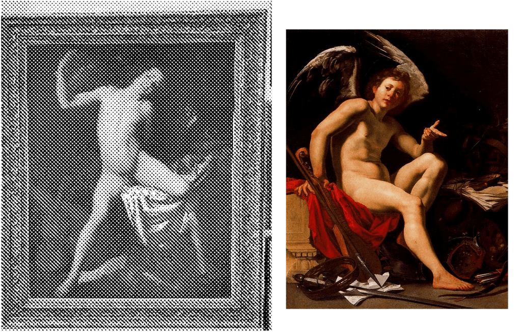 In their role as auction-price-maximisers, Sotheby’s would have us believe that the crude, louche pastiche of Caravaggio’s Amor Vincit Omnia at left can be attributed to the same Orazio Riminaldi who painted the restrained, non-lubricious Amor Victorioso at right. I shall not be bidding the suggested $60,000 – $80,000.