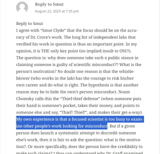 Notably, a certain ‘Jerry’ and fellow-pseudonyms ‘Reply’ and ‘Reply to Smut’ responded to a recent update on Retraction Watch, arguing that anyone querying the Croce corpus must have ulterior motives, e.g. distracting from their own misconduct. Thus critics become legitimate targets for the kind of accusations that are not legitimate when levied against Croce himself.