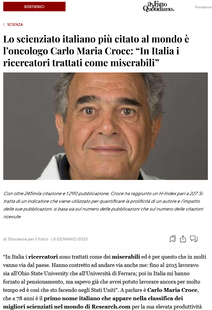 “The most cited Italian scientist in the world is the oncologist Carlo Maria Croce: “In Italy researchers treated as miserable”” Il Fatto Quotidiano, in 2023