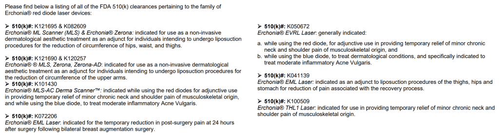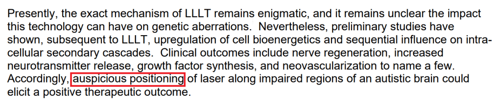 Erchonia is the company who sponsored and provided the phasers for Leisman’s 2018 autism trial. They have a number of FDA clearances already for several of their products, certifying that these are harmless and suitable as theatrical placebos – mainly for weight-loss and minor pain uses – but what they really really want is a license to apply them to autism, not just acne. Thus: