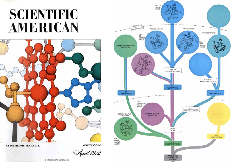 The delocalised electrons also cause porphyrin rings to absorb longer-wavelength light and become, well, πορφύρα-colored, hence “cytochrome“. I read 1970s Scientific Americans so you don’t have to.