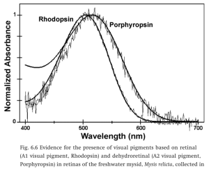 * Space does not permit a description of a plan among biohackers to shift their vision into the infrared band by replacing all the vitamin-A1 in their diets with synthetic vitamin-A2. A1 is the precursor for retinal and thence to rhodopsin synthesis. Eventually all the rhodopsin in their cone and rod cells will be replaced with the porphyropsin analogs, built around dehydroretinal, which have absorption spectra that are shifted by about 30 nm.