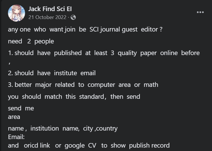 These posts include invitations to writers to provide manuscripts, to authors of papers to sell authorship slots, to current journal editors, potential guest editors, and peer reviewers, whom they are willing to be pay $5 per review. The papermillers know that guest editors and peer reviewers need publishing records and institutional emails to appear reputable.