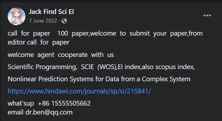The company sometimes solicits authors to submit papers on Facebook as well. Jack Ben posted a call for 100 papers in a Hindawi special issue in the Hindawi journal Scientific Programming, titled “Nonlinear Prediction Systems for Data from a Complex System“. Let’s have a look at this special issue, which has 11 articles and has so far survived Hindawi’s mass retractions.