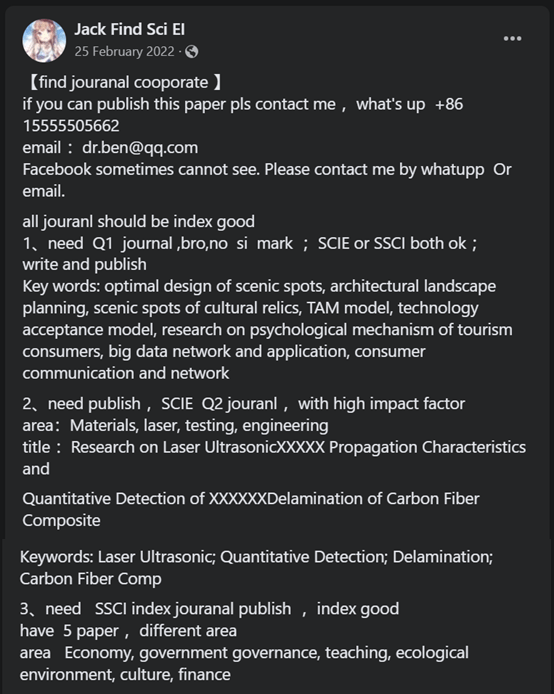 Jack Ben also requests help publishing specialised papers, presumably if there is no suitable journal candidate in their current list of cooperative journals. On 25 February 2022 he provided the title of one such paper, “Research on Laser Ultrasonic Propagation Characteristics and Quantitative Detection of Delamination of Carbon Fiber Composite”.