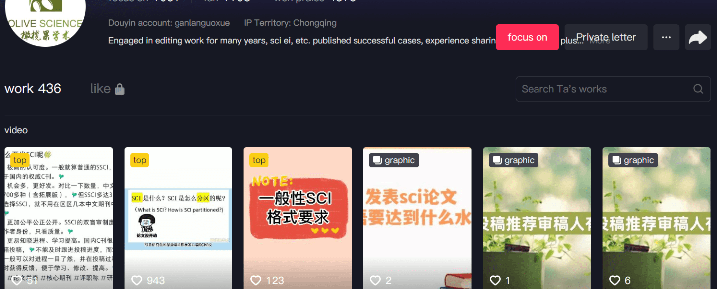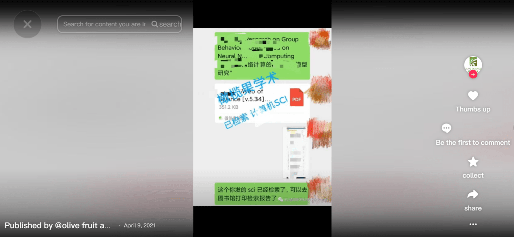 Another way that Olive Fruit Academic advertises is through Tiktok, or Douyin as it is known in China. Most of the posts are advice on how to write an academic paper or how to publish in an SCI journal, however there are also some posts showing proof of acceptance for papers they have worked on.