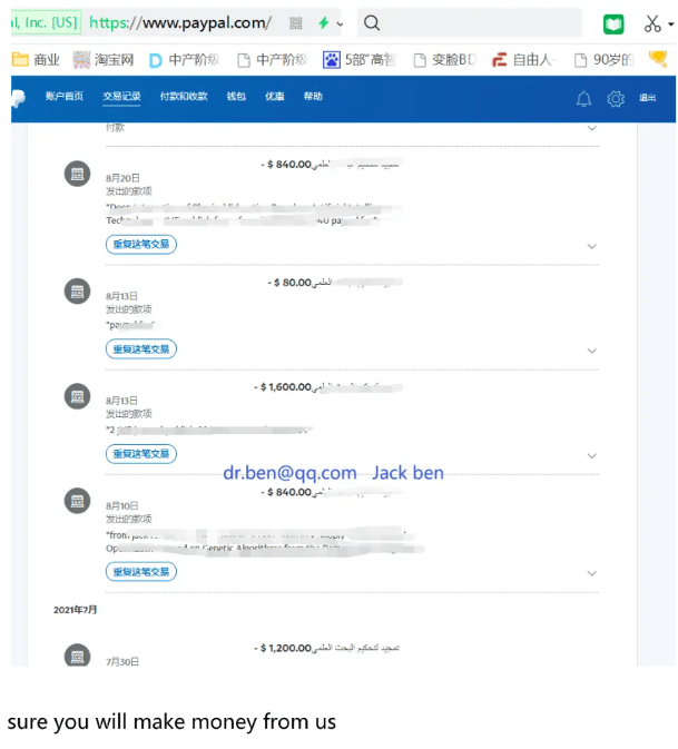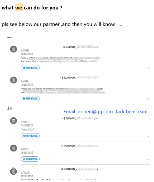 The financial transactions shown earlier are not the only ones in the documents shared by Jack Ben, and they are equally informative. The four screenshots below show multiple transactions for thousands of dollars. The top left is undated (I believe) and is for $7,700. Although heavily blurred, we can make out Amman, Jordan, and Malik Alazzam. In the top right image, parts of the word Jordan can be made out in, as well as perhaps parts of Malik Bader Alazzam as payee, in payments of around $8,000 made every week or two. The bottom left image shows a payment of $16,300 to an M…….zzam in Jordan, and finally there is a payment received of $20,995 from someone whose banking is in Arabic. Whether or not all of the payments are directly to Dr. Alazzam, this snapshot suggests that an academic can easily make $10,000 a month by accepting papers, more than the vast majority of academic salaries, and that the going rate for a single paper is around $1,000.