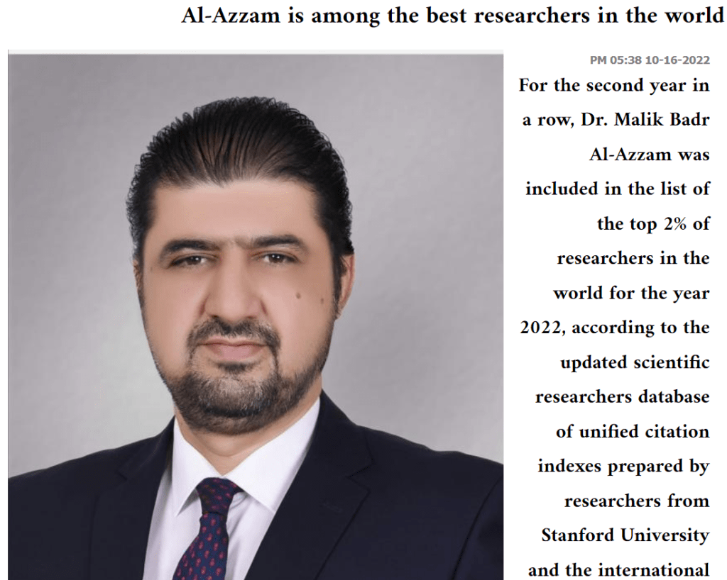 The only person named on the ‘Meet Our Team’ section of the website is Dr. Malik Alazzam, former assistant professor at Aljoun National University, Jordan, and since 2017 editor at Tamjeed, according to his LinkedIn. The office of Tamjeed is also located in Jordan, in the city of Irbid. Tamjeed are very proud of Dr. Alazzam; the pinned post on both their X/Twitter profile and one of their Facebook pages is this news story from a Jordanian news website announcing that Dr. Alazzam has been named as a top 2% scientist for 2022, as well as 2021. He is still there on the latest October 2023 update to the list.