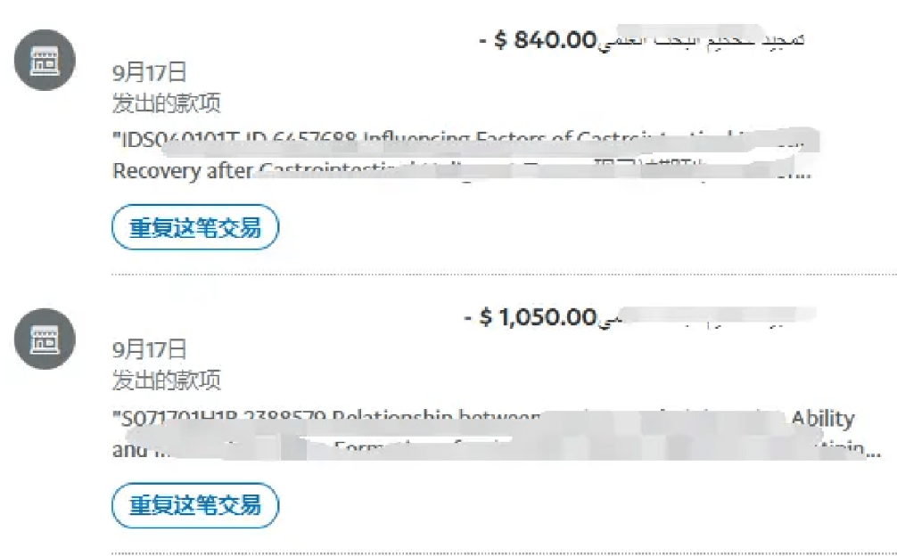 The images above show screenshots of a bank account, presumably one controlled by Olive Fruit Academic, showing repeated payments to someone totalling $8,550 from the 30th July to the 17th of September 2021. Although mostly obscured, the earliest payment has left the recipient’s name untouched, and it appears that this same name is the recipient of all the payments, despite the blurring. Additionally, two of the payments in each image have used the title of the accepted article as the payment reference. The rate is $840 for three of the papers and $1,000 for one of them. Where are those published?