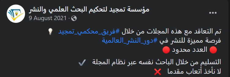 “Tamjeed is one of the first and the biggest institutions in the Middle East and Gulf States in the field of services and educational consultancies. We have submitted more than 5000 [papers] in the Middle East and Gulf States in Scopus, Web of Science, and Clarivate Journal rankings. Tamjeed is tailored to Arab researchers and academics in various universities and majors for reviewing their research and publishing them in the best publishing houses.”