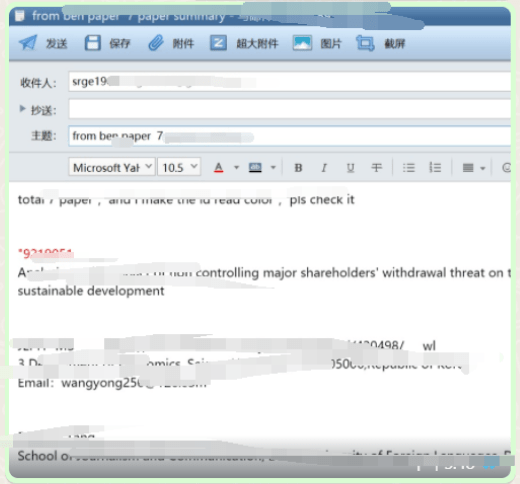 One more paper can be identified from the Tiazin papermill documents. In a screenshot of an email about 7 papers, an email address, wangyong25… is mostly visible.