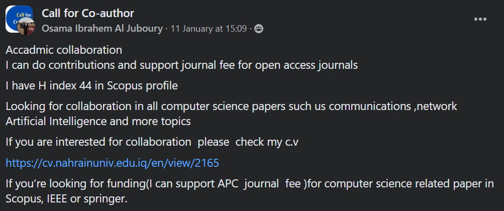 His prodigious rate of publications and citations must be helped by his frequent posting in co-authorship groups on Facebook, asking to ‘collaborate’ and offering to help with publishing fees.
