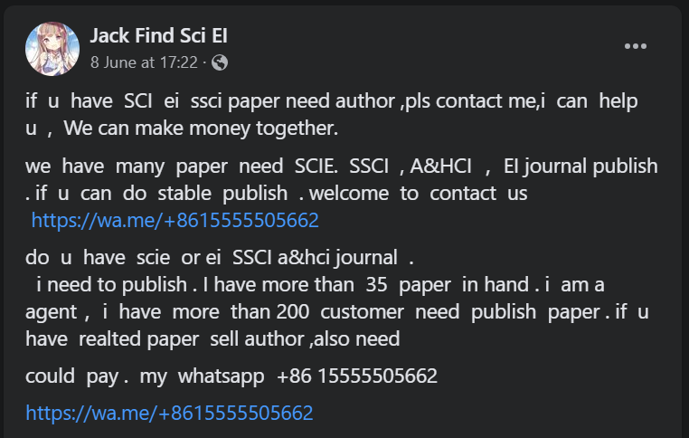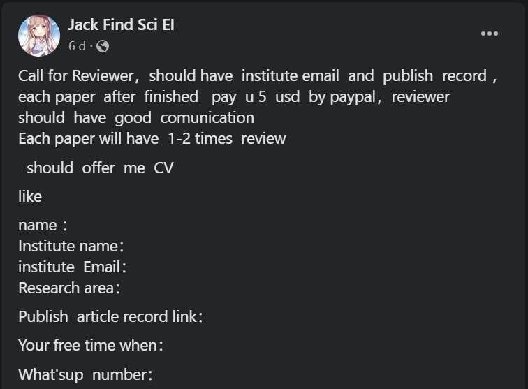 These posts include invitations to writers to provide manuscripts, to authors of papers to sell authorship slots, to current journal editors, potential guest editors, and peer reviewers, whom they are willing to be pay $5 per review. The papermillers know that guest editors and peer reviewers need publishing records and institutional emails to appear reputable.