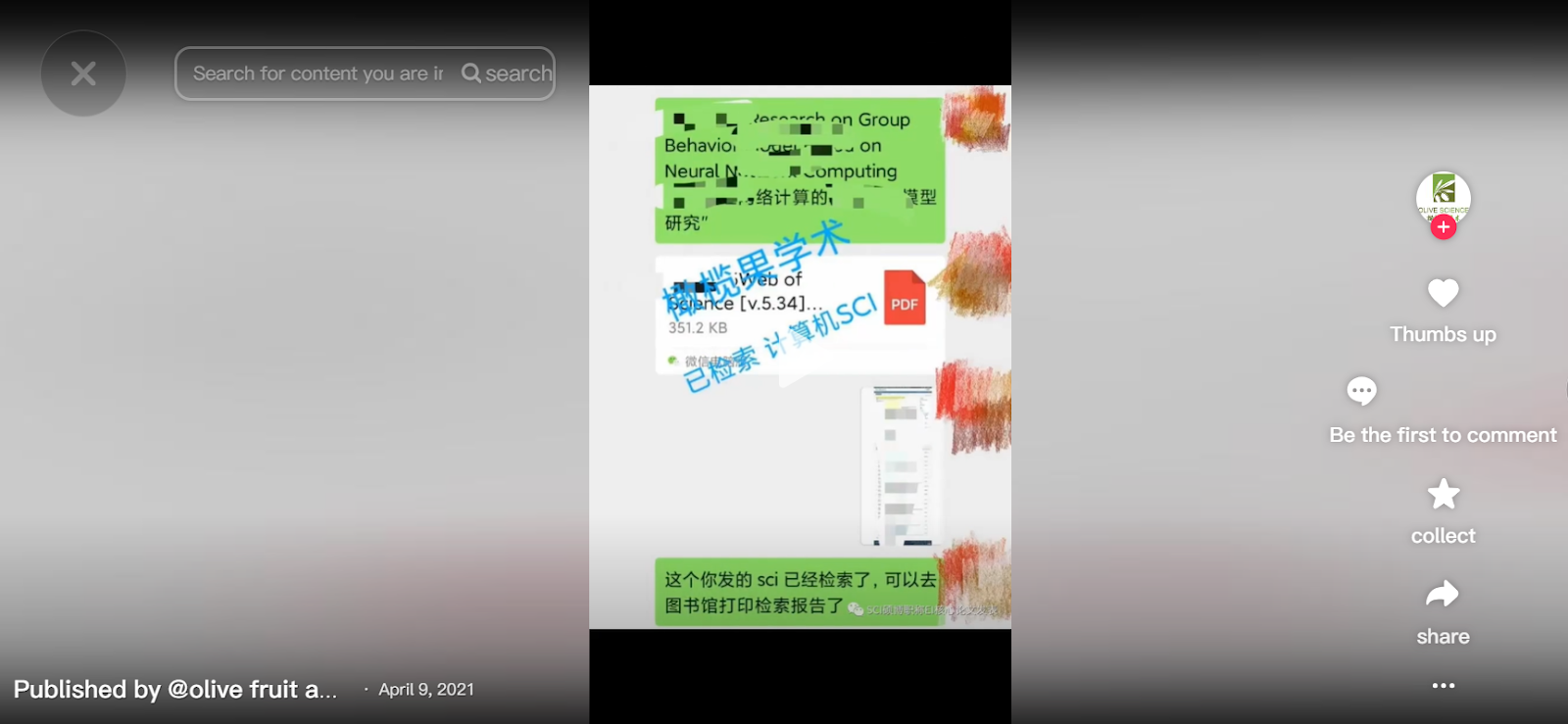 Another way that Olive Fruit Academic advertises is through Tiktok, or Douyin as it is known in China. Most of the posts are advice on how to write an academic paper or how to publish in an SCI journal, however there are also some posts showing proof of acceptance for papers they have worked on.