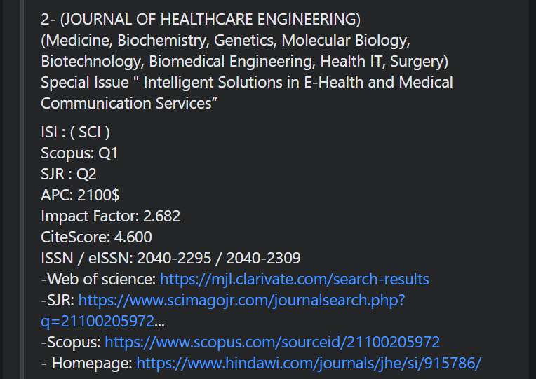 The first Special Issue is named in a Facebook post by Tamjeed from August 2021, whilst the second isn’t named explicitly, but the journal Mobile Information Systems appears directly below the Special Issue in Journal of Healthcare Engineering.