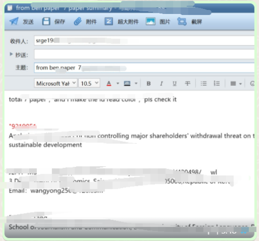 One more paper can be identified from the Tiazin papermill documents. In a screenshot of an email about 7 papers, an email address, wangyong25… is mostly visible.