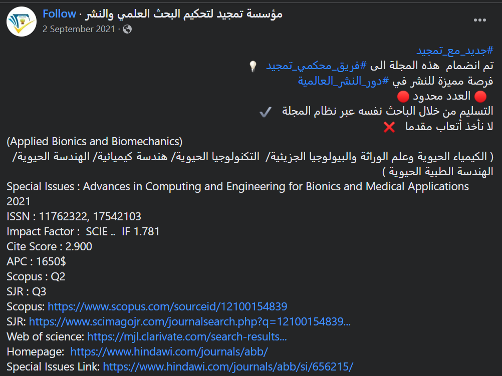 “Tamjeed is one of the first and the biggest institutions in the Middle East and Gulf States in the field of services and educational consultancies. We have submitted more than 5000 [papers] in the Middle East and Gulf States in Scopus, Web of Science, and Clarivate Journal rankings. Tamjeed is tailored to Arab researchers and academics in various universities and majors for reviewing their research and publishing them in the best publishing houses.”