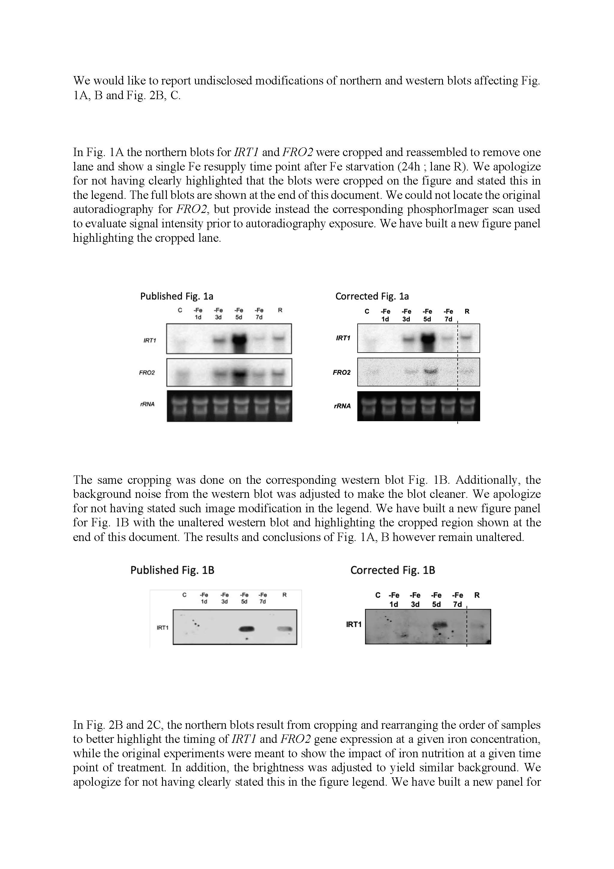 “The original western blot shown in Figure 1C monitoring IRT1 protein accumulation in wild-type or irt1-1 knock-out mutant, in both roots and shoots, and in response to iron nutrition was cropped and reassembled to present the data in a more logical way. This unfortunately led to a mistake during figure mounting, with the duplication of part of the blot and mis-annotation of the lanes. The original and corrected Figure 1 are shown below. The results and figure legend are unaltered by this correction. […]