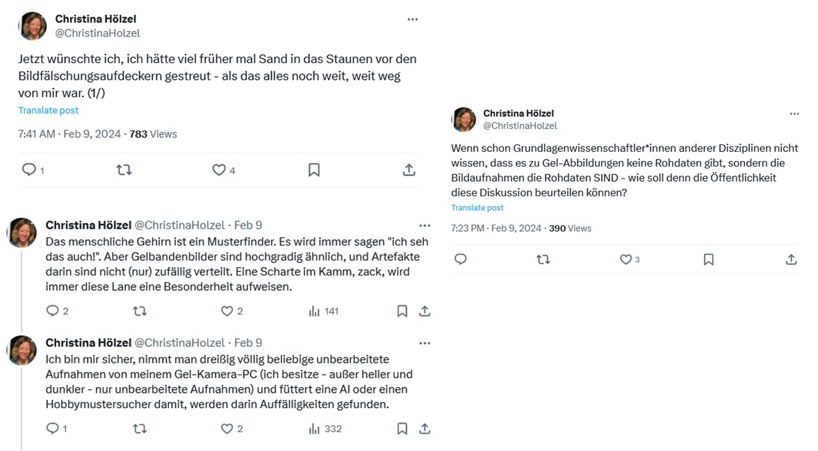 Duschl is an astrophysicist specialising in astrobiology, so I suggest he learns some biology. Gather is a statistician, she should know the statistical probability of gel bands being that similar. But here is a life scientist – Kiel’s microbiology professor Christina Hölzel, who explains that the gel band duplications in Fulda’s papers are normal and expected technical artefacts, and it is wrong to ask for raw data of gel figures because those do not exist: