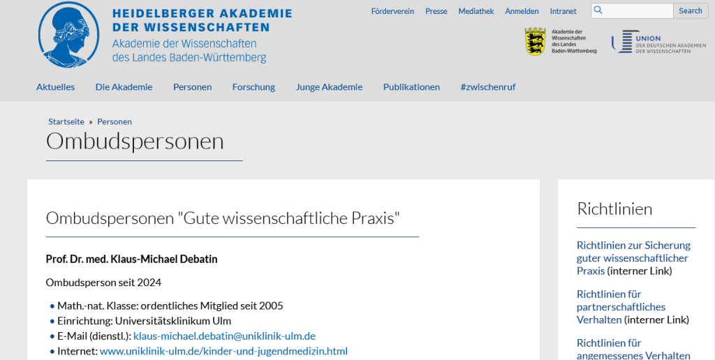 “…neutral and personally integer ombudspersons to advise, preliminarily examination and arbitration of conflict cases in questions of good scientific practice.. …” Heidelberger Akademie der Wissenschaften
