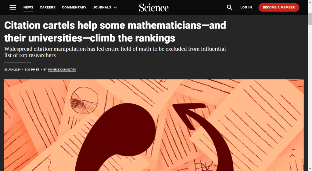 The Matthew Principle applies even to Mathematics. The field has an image of ivory-towered unworldly theorists for whom the concepts of ‘practicality’ and ‘applications’ are alien… but when not converting coffee into theorems, even mathematicians are aware that for large enough X and Y it is good when X many of their papers are cited by Y other authors. Concerns have been growing for years that certain countries and institutions have adopted citation shenanigans as official policy, to the extent that the bibliometric company Clarivate finally disqualified mathematicians from their tendentious “Highly Cited Researcher” scoreboard, which in turn triggered Michele Catanzaro to write about the scandal for Science.