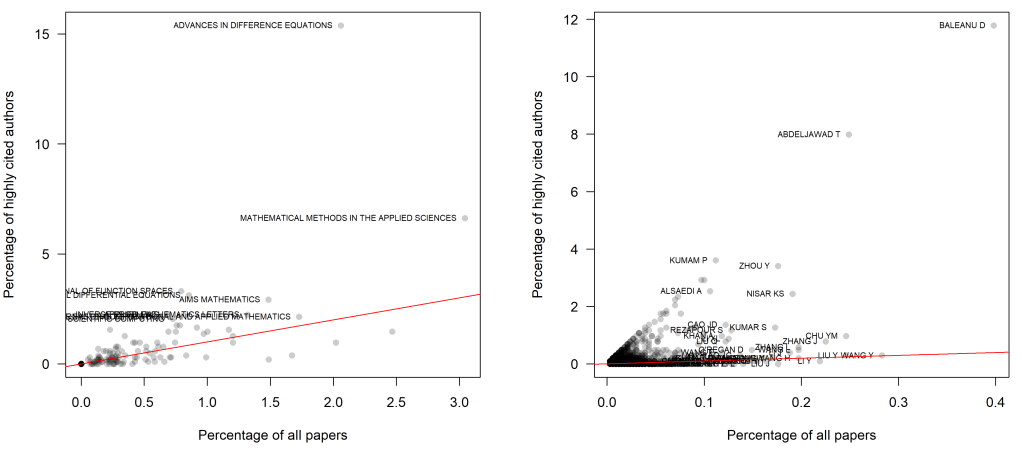 ** My colleague began with Ioannidis’ list of highly cited researchers in 2019, and filtered out 349 researchers who were working in applied mathematics; then searched Web-of-Science, finding 1027 papers published by these authors in the year 2020. Then these papers from high-performing mathemagicians were compared with all the 2020 papers in the applied-mathematics field.