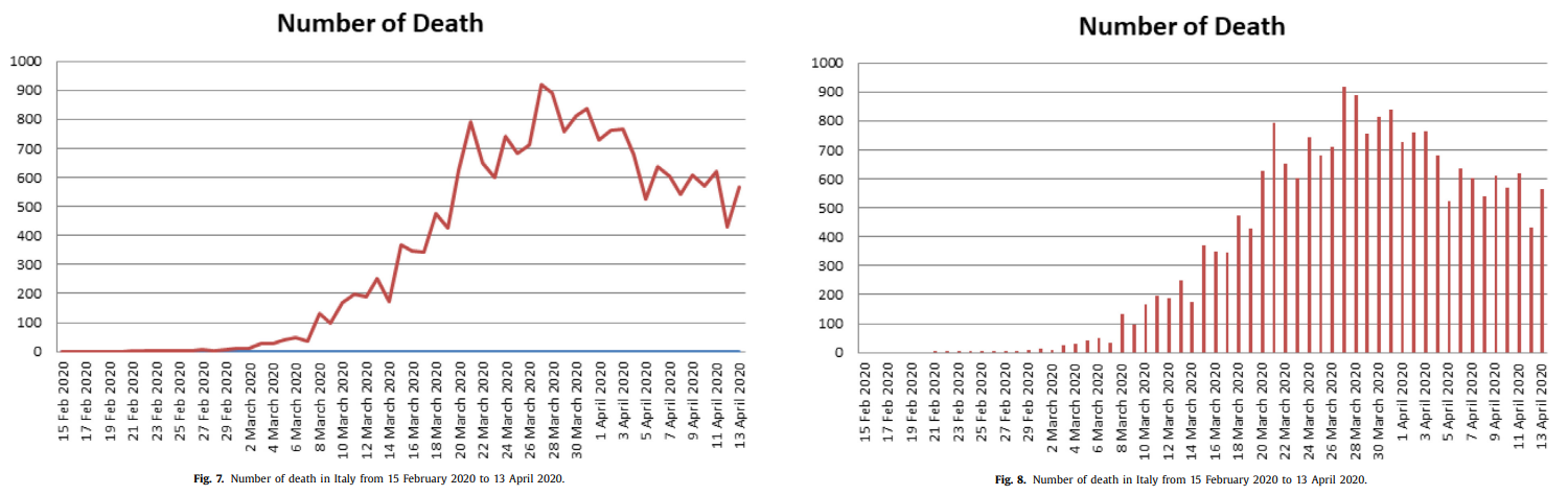 Atangana informs us that “In this paper, using data from Italy, we presented some basic statistical figures to give an indication of the spread profile.” In fact the analysis consists of numerical simulations of the spread of some hypothetical non-COVID disease under various implausible conditions; it does not draw upon the Italian data at any point. As if to make up for this neglect, the author plots the irrelevant Italian numbers twice – as line graphs and as bar charts.
