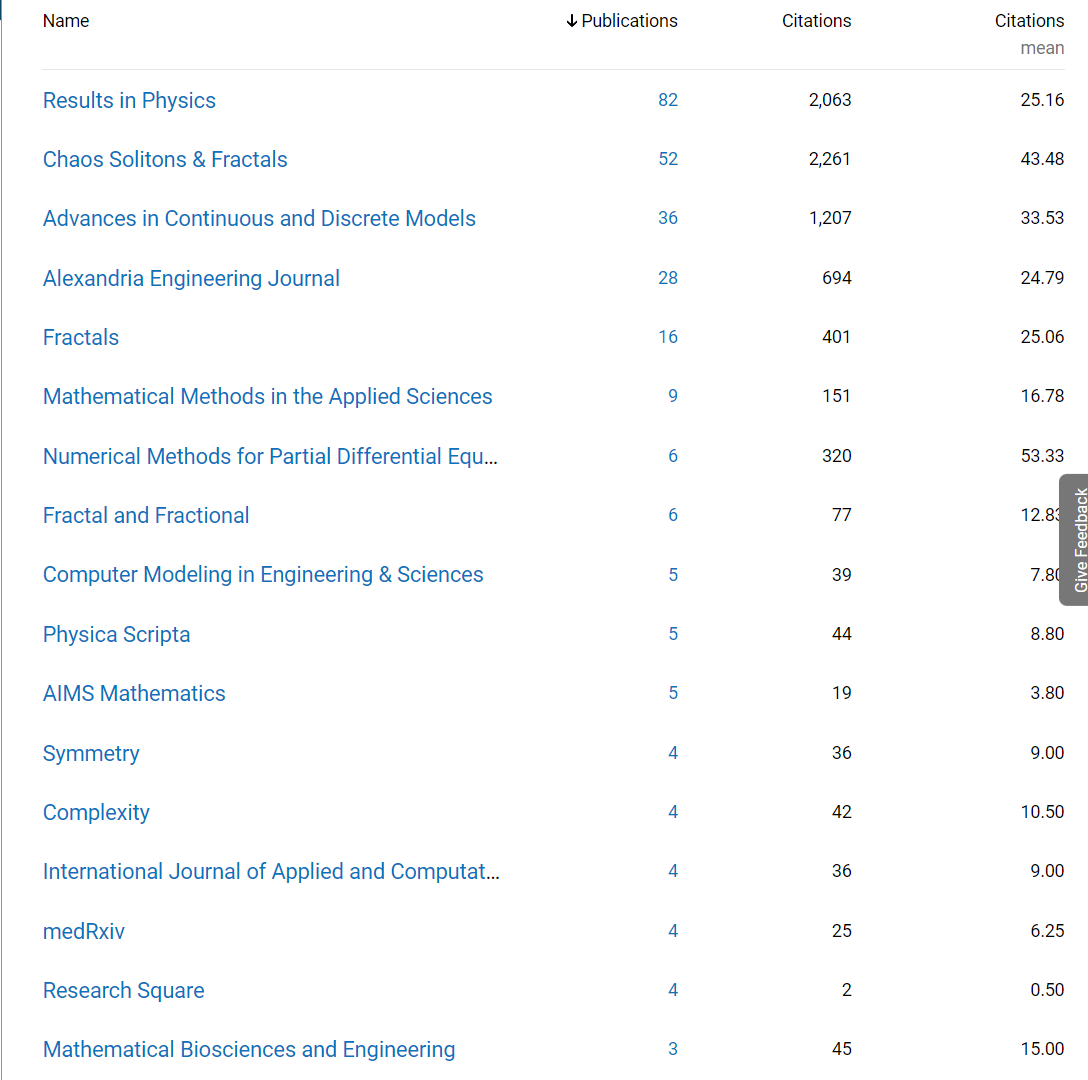 While at right, the prominence of specific authors. The raw data were drawn from maths journals, while Atangana prefers engineering or interdisciplinary or physics journals, which is (I am advised) why he doesn’t show up. Second place is occupied instead by T. Abdeljawad, a frequent Baleanu collaborator.