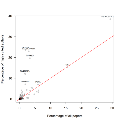 I also received this plot where the citational productivity of highly-cited mathematicians (by country) is plotted against productivity for all mathematicians. Evidently there are countries where the citational elite dominate the whole citation economy. Notably Taiwan, Saudi Arabia and Turkey, but also China, up in the upper-right corner. Ideally, Clarivate or some other bibliometric specialist would calculate the Gini Coefficient of citation inequality, so we could compare the distributions for different countries and mathematical establishments.