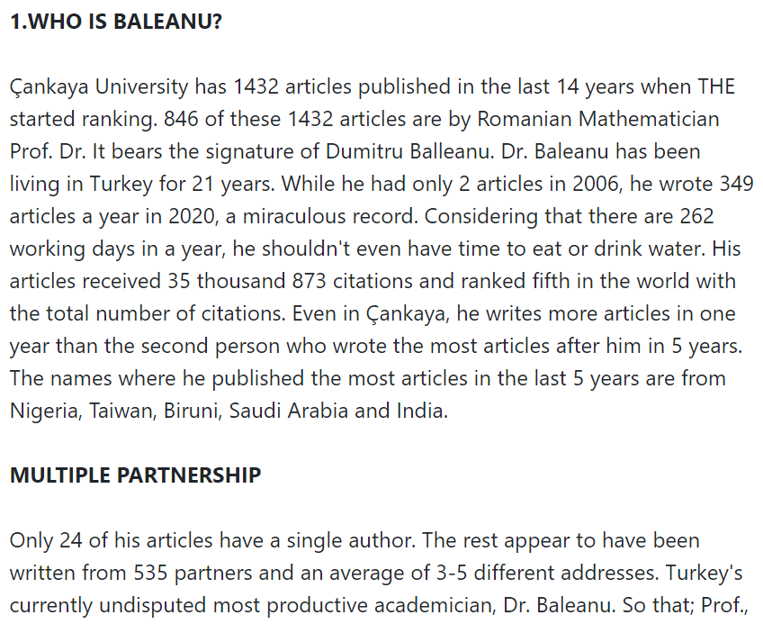 In January 2022 a Turkish journalist described Baleanu’s prodigious productivity in tones of polite raised-eyebrows incredulity that bordered on accusations of shenanigans. She focused on his cosmopolitan collaborations; and on his role in the rising profile of Çankaya University during its three decades of existence, dragging it singlehandedly into the purview of the Top University rankings from Times Higher Education.